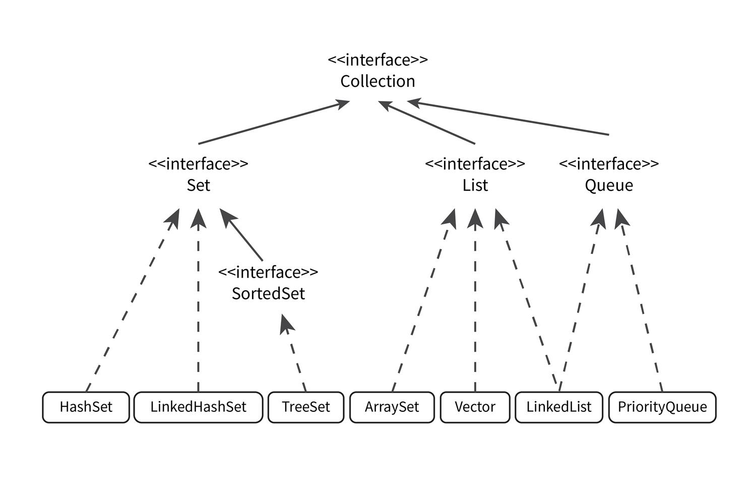 На рисунках сплошными линиями представлены отношения Extends, а пунктиром — отношения Implements. Эти отношения важны и всю информацию о них вы найдёте в теории по Java.